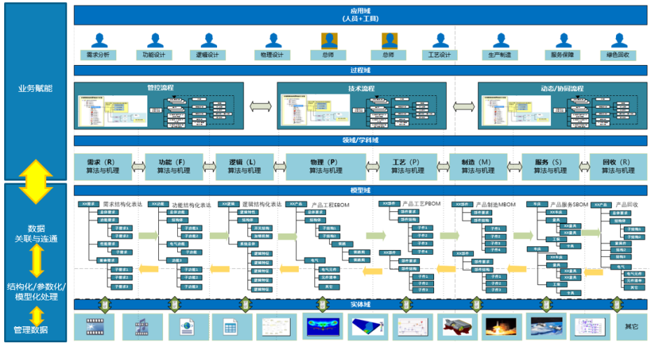 從以文檔為中心向模型數據驅動的研制模式轉型,重點是構建實物產品的數字產品空間。利用產品數字化、過程數字化、規則數字化技術,形成產品數據域、過程域和業務域的融合,支持全生命周期模型體系管理,以及全生命周期技術和管理活動,逐步形成模型數據驅動的數字化研制過程。PLM作為管理產品所有資產并有效協同各利益方的基礎系統,是研制模式變革的直接支撐。